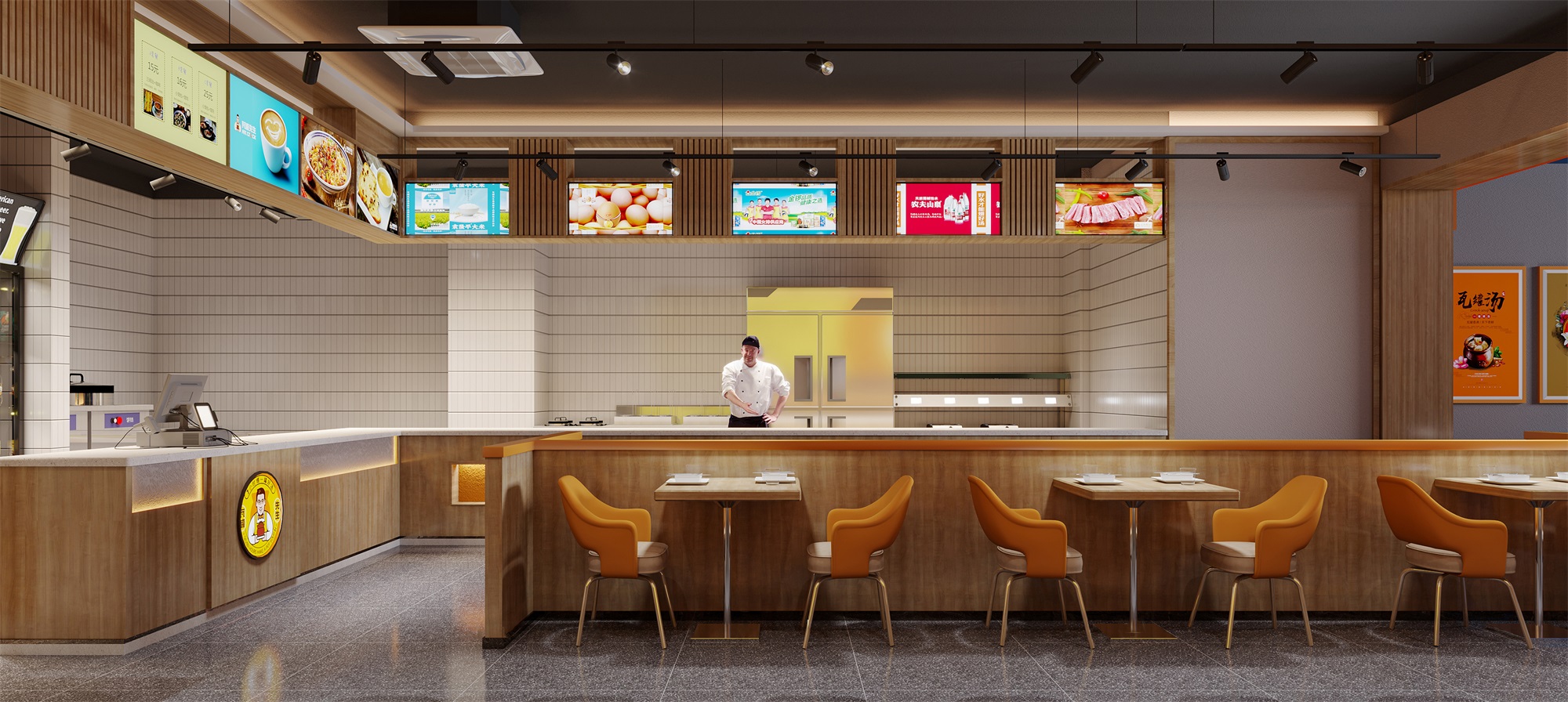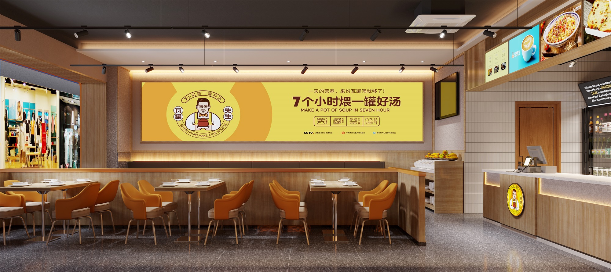 瓦罐先生是一個以傳統瓦罐煨湯江西特色的現代餐飲品牌,主打便捷、健康的煨湯與燜燒菜品。項目位于深圳地鐵站內美食街,總面積60平方米,外擺區10平方米。設計以現代風格為基調,門頭采用高飽和度的橙色軟膜燈箱,在快節奏的地鐵環境中形成強烈視覺記憶點。室內通過暖木色與顆粒感藝術漆的碰撞,平衡工業感與溫馨氛圍;外擺區則利用可折疊家具與綠植墻,靈活適應高峰時段需求。空間布局注重動線優化,明檔廚房結合品牌文化墻,強化“現煨現賣”的新鮮體驗,助力“瓦罐先生”在競爭激烈的美食街中脫穎而出。
