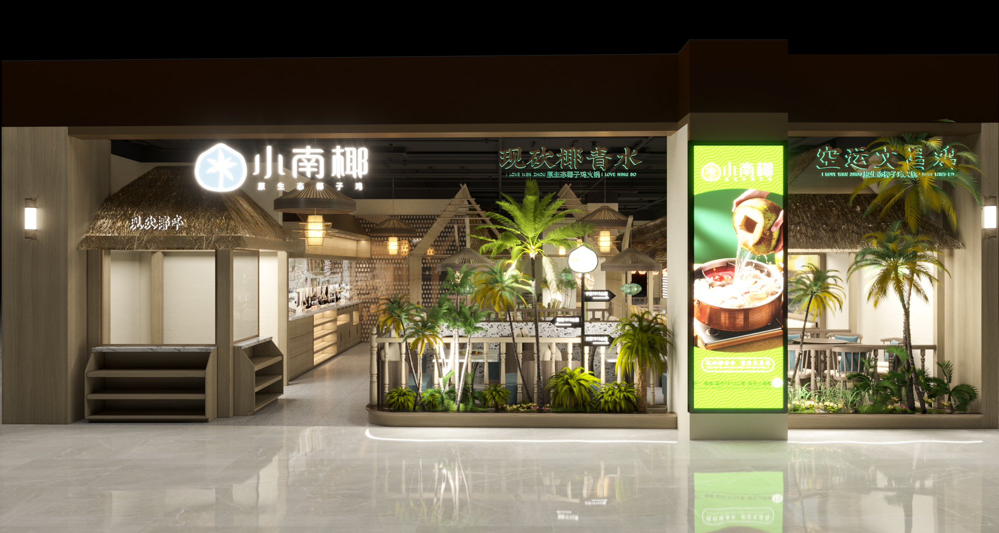 作為深圳商場內(nèi)280㎡的森系餐飲空間,小南椰原生態(tài)椰子雞旨在打造一個自然、清新、沉浸式的用餐體驗。品牌以海南椰子雞為核心產(chǎn)品,強調(diào)原生態(tài)食材與健康飲食理念,因此空間設(shè)計需要呼應(yīng)“自然、有機、放松”的調(diào)性,同時兼顧商場店的商業(yè)效率與氛圍營造。