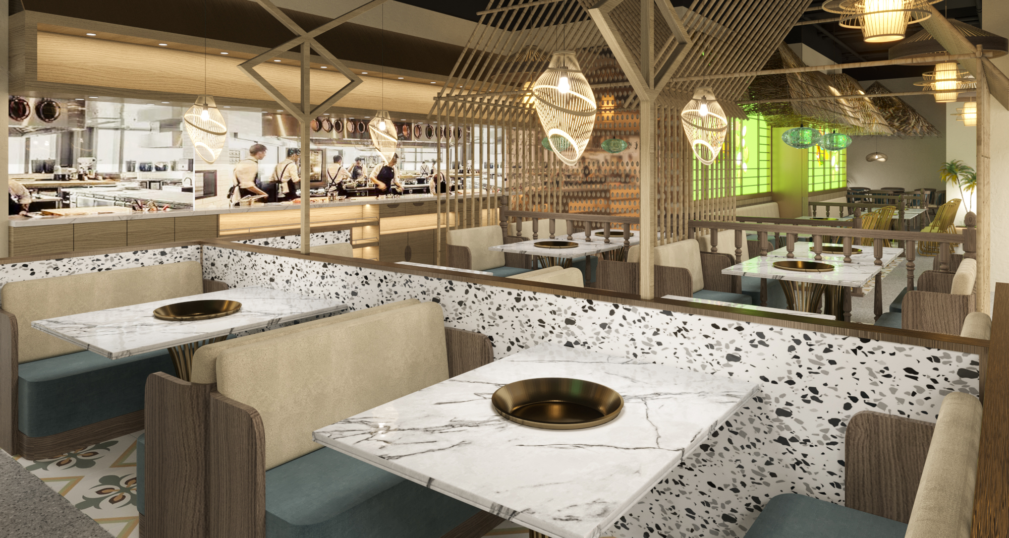 在都市快節(jié)奏的生活中,消費者渴望逃離鋼筋水泥,享受片刻的自然療愈。因此,我們以“都市綠洲”為概念,通過原木、草編、綠植等自然元素,結(jié)合柔和燈光與流動的線條,營造出熱帶雨林般的用餐環(huán)境。空間布局上,開放式廚房增強互動感,卡座區(qū)保證私密性,并設(shè)置適合打卡的景觀位,提升社交傳播性。
