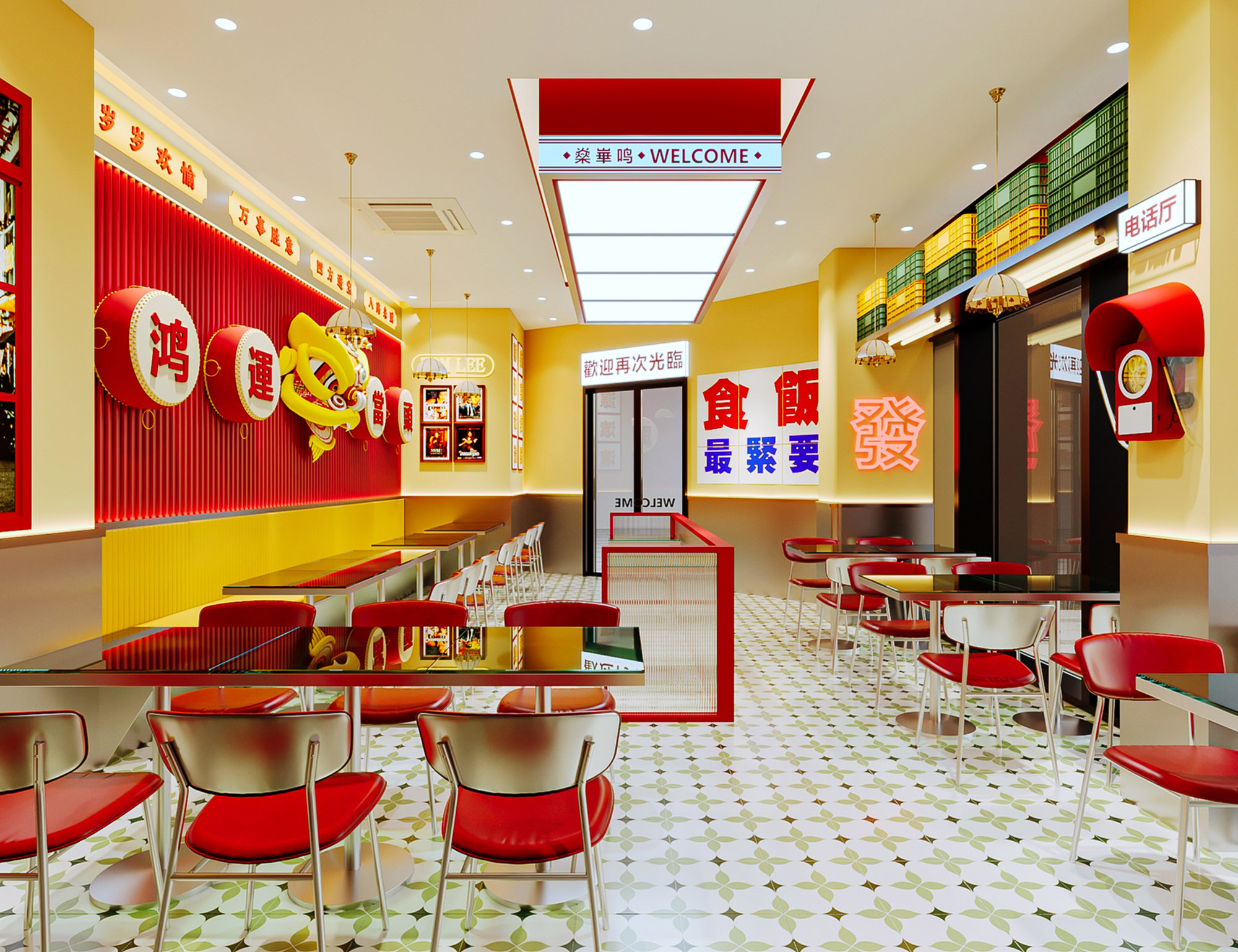 坐落于深圳寶安西鄉(xiāng)的星輝里商圈拐角處,燊華鳴茶餐廳的門頭特別搶眼,180°的超大展示面,吸睛效果直接拉滿!紅色波浪板配上金色不銹鋼包邊,一到晚上點光源一亮,整條街就屬它醒目,老遠(yuǎn)就能看見。推門進(jìn)去,腳下是經(jīng)典的港式花磚,紅綠配色復(fù)古又耐臟,走起來還有點懷舊的味道。